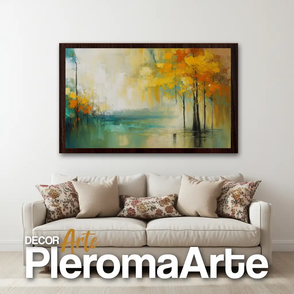 Venta de cuadros Dream Landscape es una obra que evoca la calma de un paisaje onírico, donde los reflejos del agua se funden con la luz dorada del bosque. Su composición combina verdes acuosos, turquesas profundos y amarillos cálidos, atravesados por árboles estilizados en tonos naranjas y dorados que transmiten serenidad y vitalidad. Este cuadro se convierte en un portal hacia la contemplación, ideal para llenar de frescura, armonía y sofisticación los espacios de tu sala, comedor u oficina.
